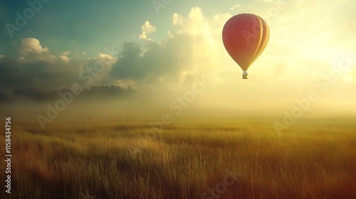 © Thirakun, Obraz premium Hot air balloon floating through soft morning light over an expansive field