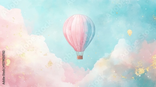 Obraz premium Hot air balloon flying in a dreamy sky with clouds