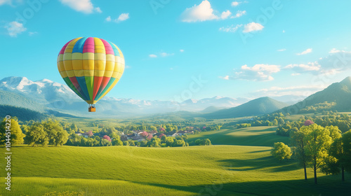 Obraz premium Hot Air Balloon Flying Over Green Fields