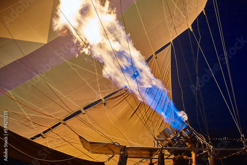 © h368k742, Obraz premium Hot air balloon heater with flame at night. Ballooning