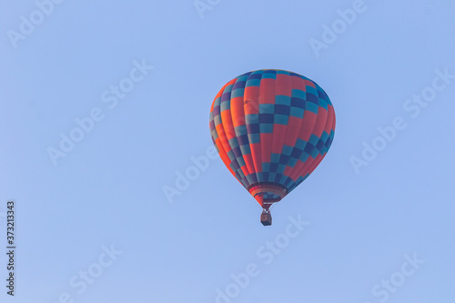 Naklejka premium Hot air balloon in flight against a background of blue sky. Colorful balloon...