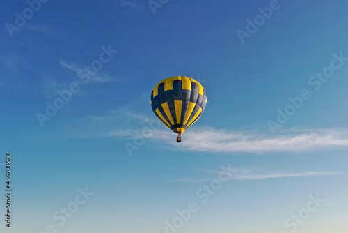 © alzay, Naklejka premium Hot air balloon in flight at sunset. View from the drone.