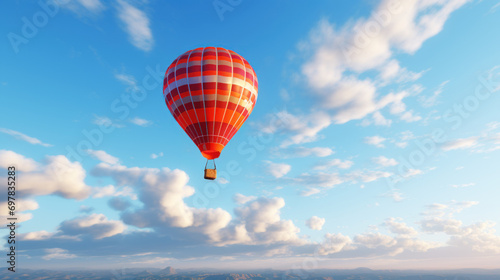 Fototapeta premium Hot air balloon in the sky. Fantastic adventure, flying in the skies. Can be used in travel or inspirational content, adventure themes, illustrating freedom, exploration, or peaceful journeys.