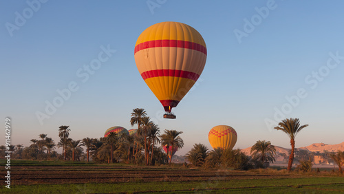 Obraz premium Hot air balloon is inflating before liftoff - Hatshepsut Temple at sunrise in...