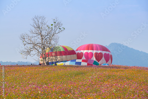 © tomruethai, Obraz premium Hot air balloon over cosmos flowers with blue sky