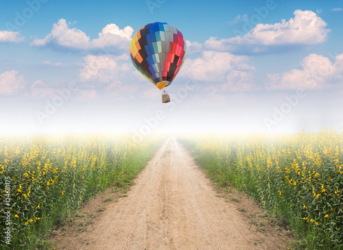 © littlestocker, Fototapeta premium Hot air balloon over dirt road into yellow flower fields with fog