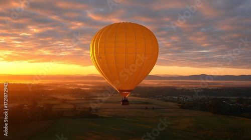 © Hanna, Naklejka premium Hot air balloon rising at sunrise over a misty landscape in soft golden light