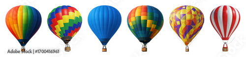 © SRITE KHATUN, Obraz premium Hot air balloon set including rainbow, checkered, solid blue, striped, and geometric patterns isolated. Adventure and travel collection.
