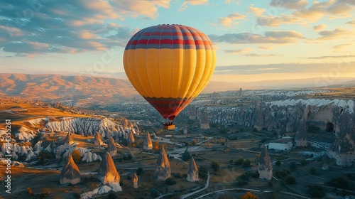 Obraz premium Hot Air Balloon Soaring Over Cappadocia's Unique Rock Formations at Sunset