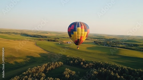 © Berkah1789, Obraz premium Hot Air Balloon Soaring Over Rolling Green Fields