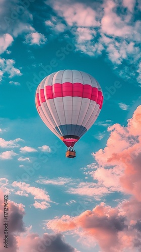© RETNO, Naklejka premium Hot air balloon soaring through vibrant sunset clouds.