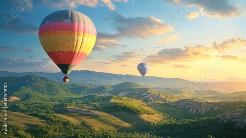 Fototapeta premium Hot air ballooners drifting high above scenic landscapes, enjoying panoramic views during a peaceful yet exhilarating ballooning adventure