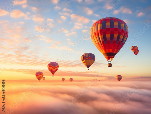 Naklejka premium Hot air balloons ascending during sunrise, whimsical colors, accompanied by a...