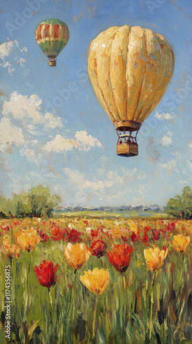 © CreativePulse, Obraz premium Hot air balloons float over vibrant tulip field under clear sky