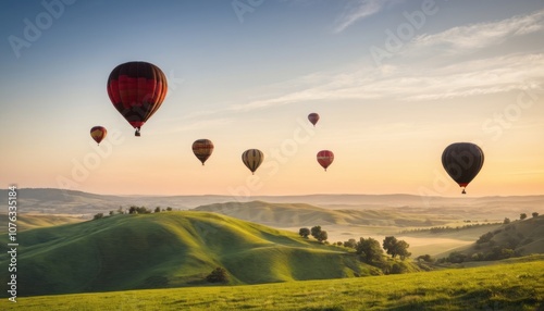 Obraz premium hot air balloons floating over rolling hills at sunrise, peaceful scene
