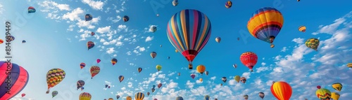 © WACHI, Fototapeta premium Hot air balloons of different colors flying in the blue sky.