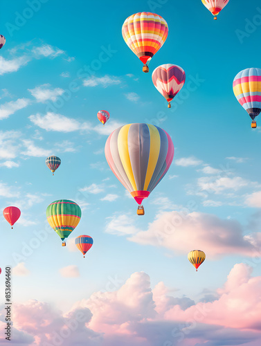 © TatjanaMeininger, Obraz premium Hot air balloons of various colors floating in the sky during a clear morning