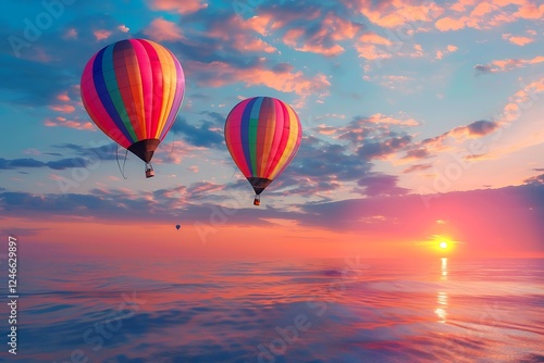© Mahmud Creative, Fototapeta premium Hot air balloons over the sea at sunset. 3d render illustration