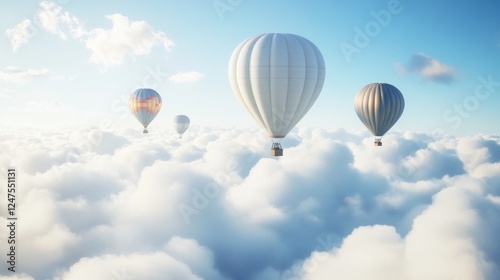 © NAIMAH, Fototapeta premium Hot air balloons soar above fluffy clouds at sunrise, ideal for travel posters