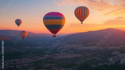 © MINHOO, Naklejka premium Hot Air Balloons Soaring Over a Picturesque Landscape at Sunset