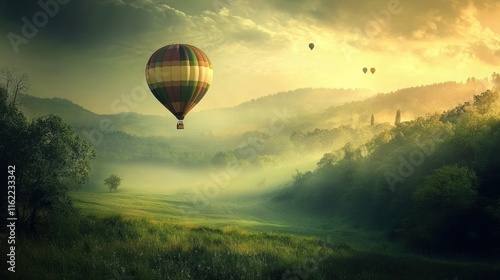 © wisnuromad art, Obraz premium Hot air balloons soaring over a serene landscape at dawn.