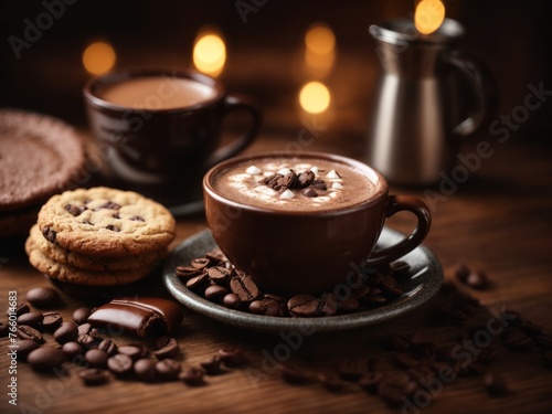 Fototapeta premium hot chocolate in cup, coffee beans and freshly baked cookies on wooden table...