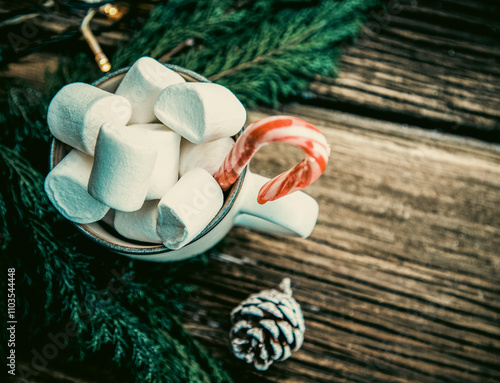 Fototapeta premium hot Christmas drink with marshmallow on wooden table