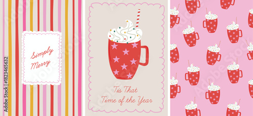 © sudevi, Fototapeta premium Hot Cocoa Christmas Card and Pattern Set with Cute Holiday Mug Illustration, Frame ,Stripes background. Ideal for holiday cards, printable gifts, winter invitations, posters, and seasonal crafts.
