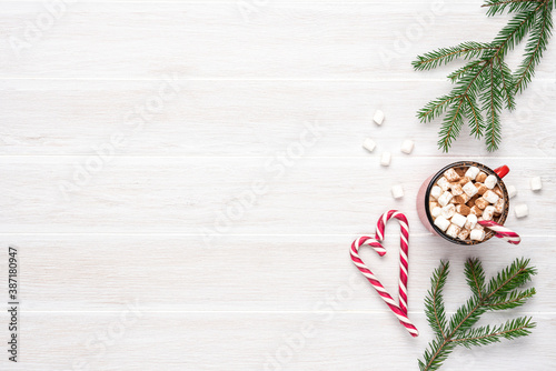 © Anna Puzatykh, Obraz premium Hot cocoa with marshmallows and candy canes on white wooden slatted background. Copy space, top view
