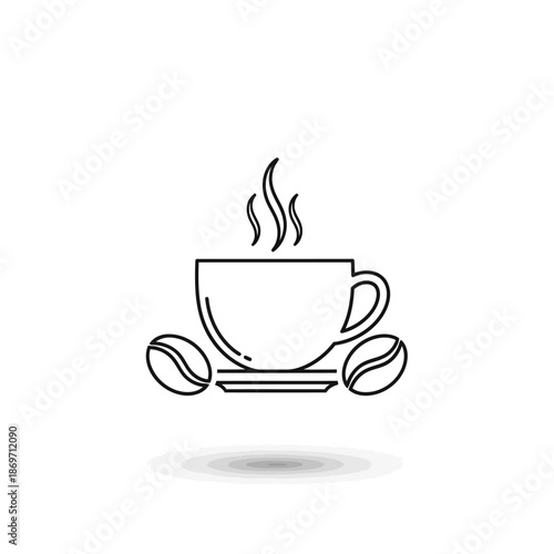 © Holand, Obraz premium Hot Coffee Cup Icon with Beans, Minimalist Line Art, Steam, Vector Illustration