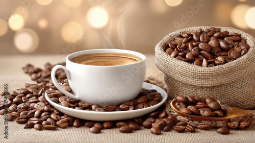 Fototapeta premium Hot Coffee in a White Cup with Steam Rising, Surrounded by Roasted Coffee Beans in a Burlap Bag and on a Wooden Surface, Warm Cozy Morning Beverage Scene