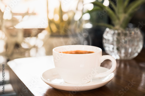 Obraz premium hot coffee in the white cup on wooden table. Sun light in cafe.