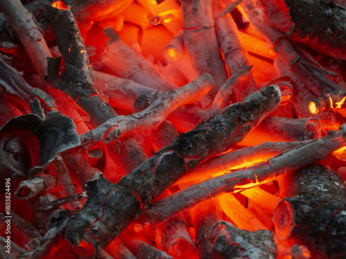 Naklejka premium Hot Glowing Red Charcoal and Burning Wood