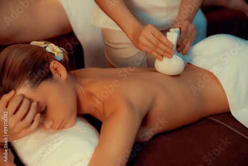 Fototapeta premium Hot herbal ball spa massage body treatment, masseur gently compresses herb bag on couple customer body. Serenity of aromatherapy recreation in warm lighting of candles at spa salon. Quiescent