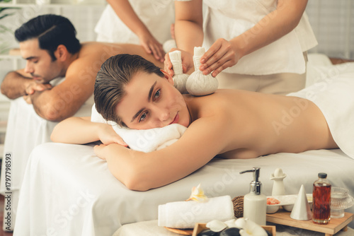 Fototapeta premium Hot herbal ball spa massage body treatment, masseur gently compresses herb bag on couple customer body. Tranquil and serenity of aromatherapy recreation in day lighting ambient at spa salon. Quiescent