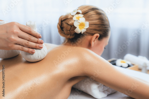 Obraz premium Hot herbal ball spa massage body treatment, masseur gently compresses herb bag on woman body. Tranquil and serenity of aromatherapy recreation in day lighting ambient at spa salon. Quiescent