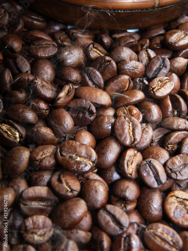 © Ldarro, Fototapeta premium Hot roasted coffee beans with a turkish cezve