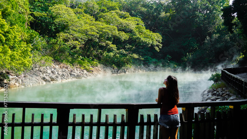 © SandyHappy, Obraz premium Hot spring water at Beitou Thermal Valley or Geothermal Valley, Taiwan. Woman traveler looking at Hot spring pond at Xinbeitou thermal valley in Taiwan.