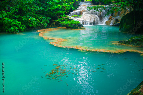 © Pongvit, Naklejka premium Hot Springs Onsen Natural Bath is Surrounded by red-yellow leaves. In fall leaves, Waterfall among many foliages, In fall leaves Leaf color change