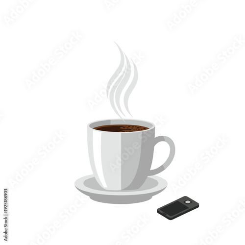 © LOBSTER LARRY, Fototapeta premium Hot steaming coffee cup with a small black remote control on a white saucer