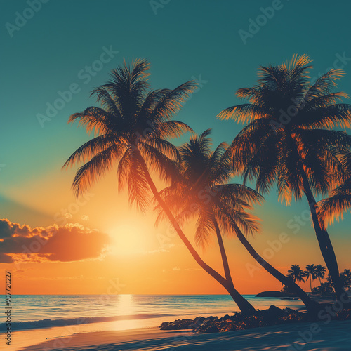© Kasa_s, Fototapeta premium Hot sun over a tropical beach with palm trees