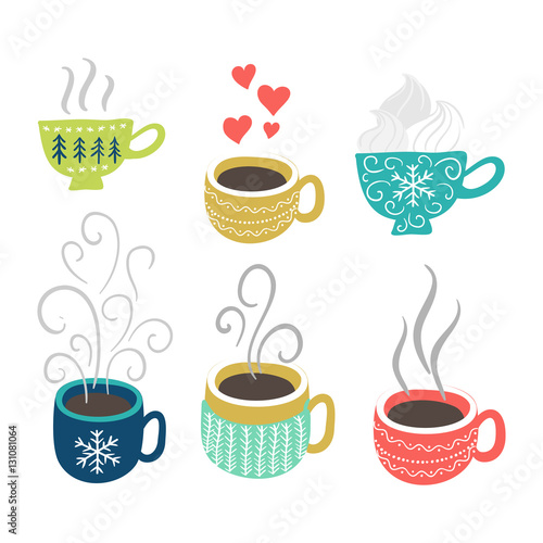 Obraz premium Hot tea, coffee cups set. Vector winter holidays elements.