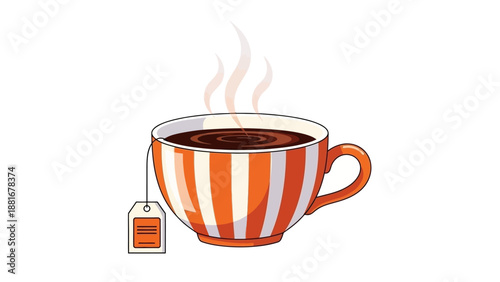 © Ryoichi, Obraz premium Hot Tea in Striped Mug with Steam and Tea Bag