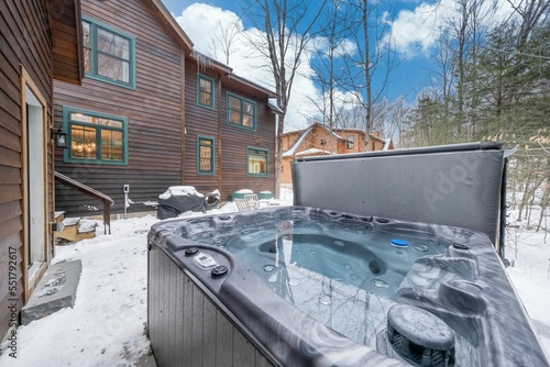 Naklejka premium Hot tub in the yard of a suburban house in winter.