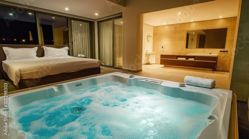 © savittree, Obraz premium Hot water jacuzzi in a stylish hotel spa, representing comfort and relaxation in a luxurious apartment setting.