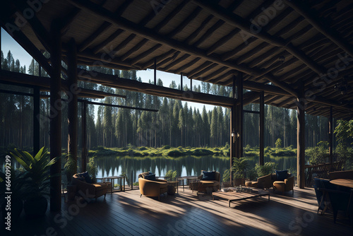 Fototapeta premium Hotel interior with lake view. Created using generative AI tools