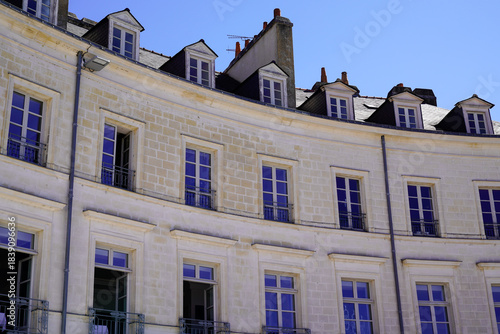 Naklejka premium hotel l'hermine in city vannes port curved historical stone facade with dormer windows against a clear sky