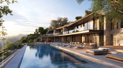 Fototapeta premium Hotel pool area with modern design and views of the