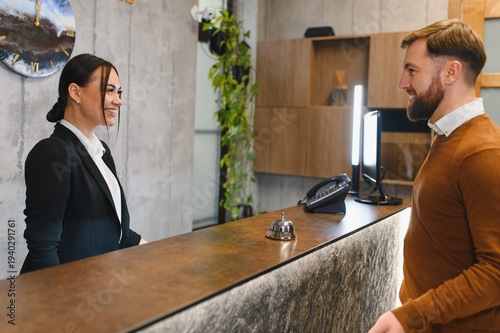 Fototapeta premium Hotel receptionist assisting guest during check in process