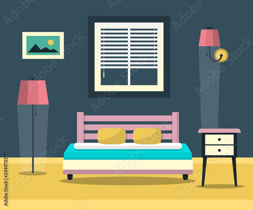© mejn, Fototapeta premium Hotel Room - Interior with Bed, Furniture and Window. Flat Design Bedroom Vector Illustration.